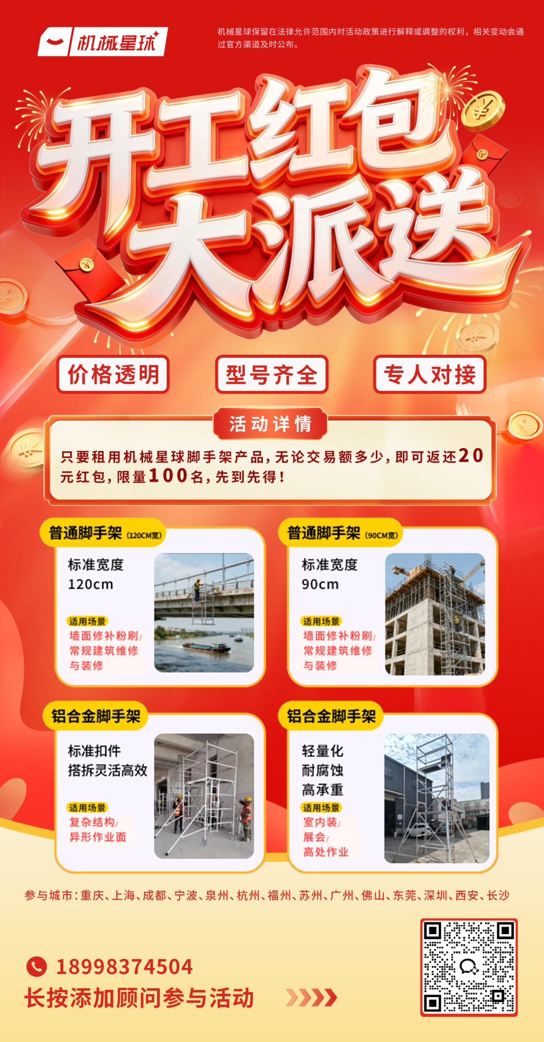 租用机械星球脚手架产品,即可领取20元红包,限量100名,先到先得!