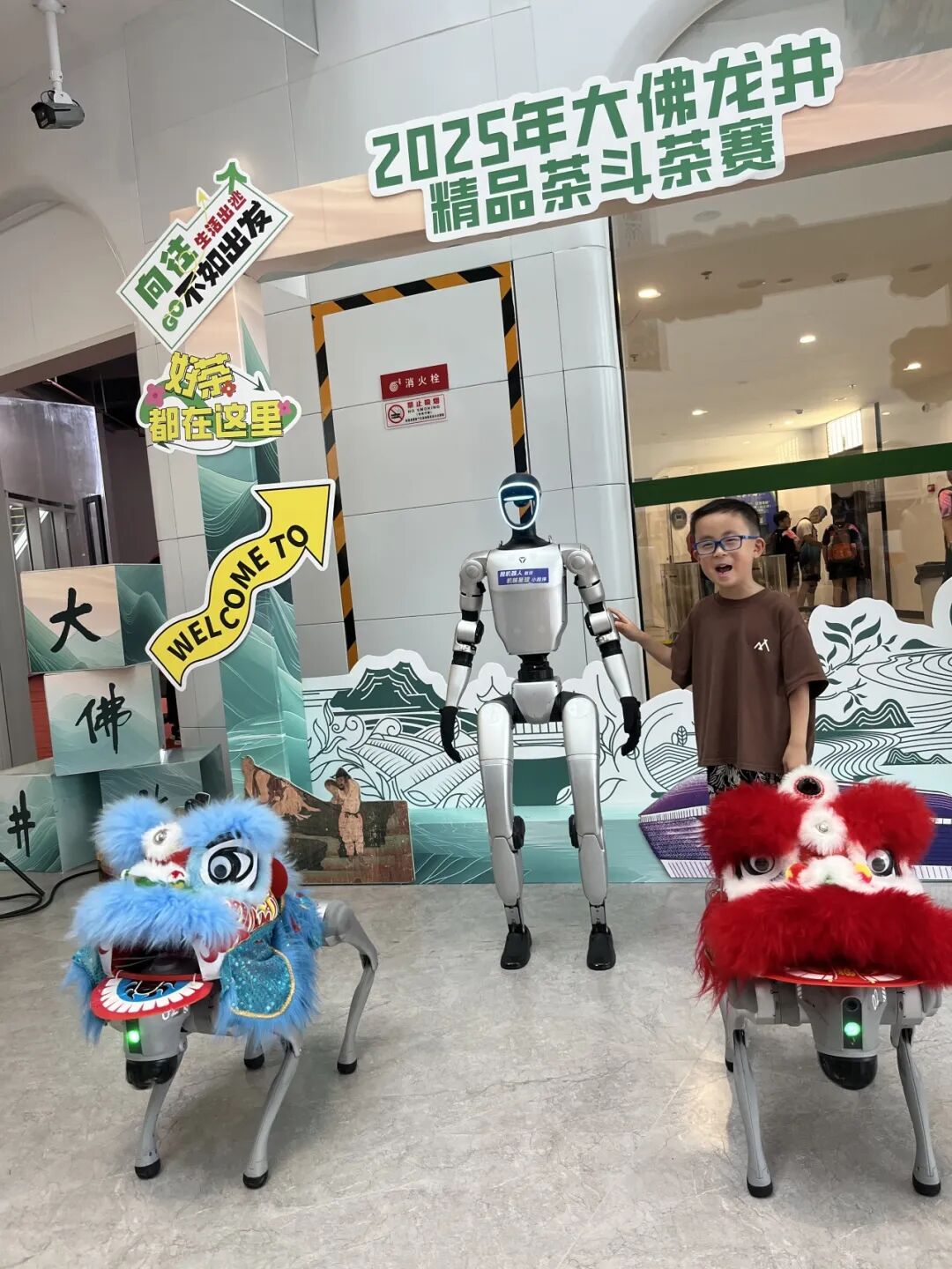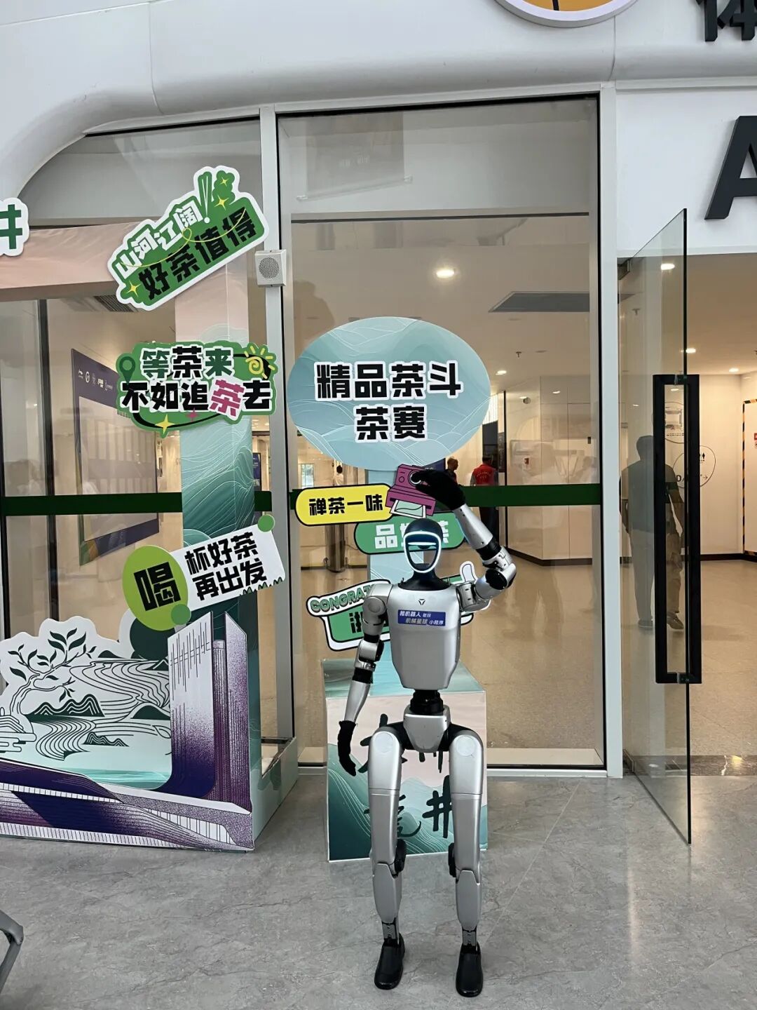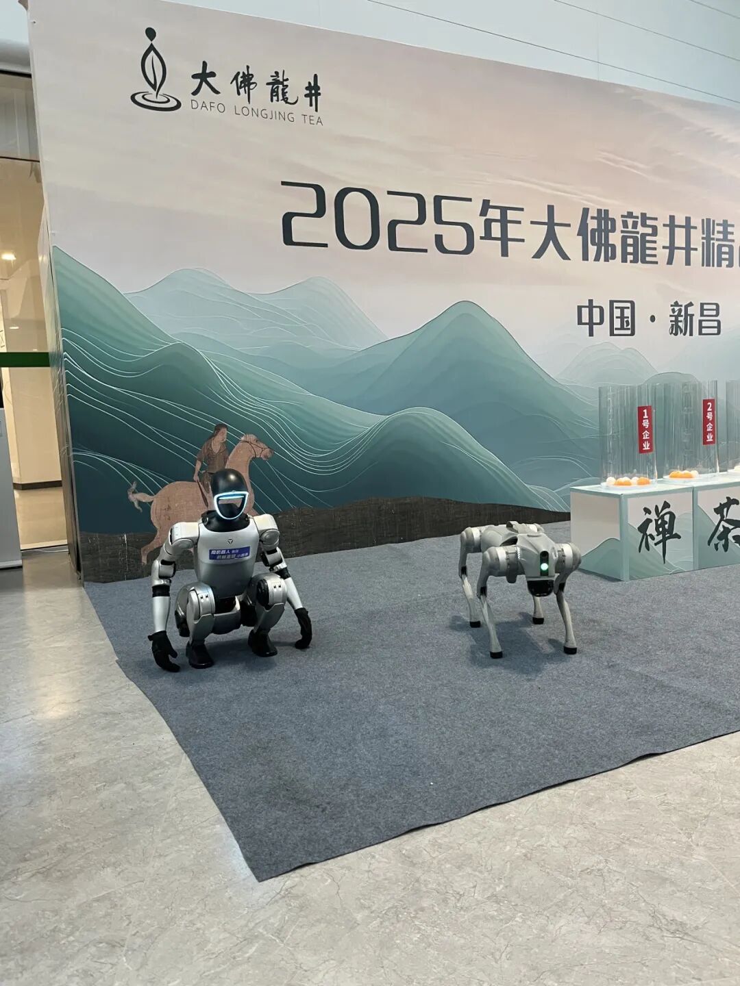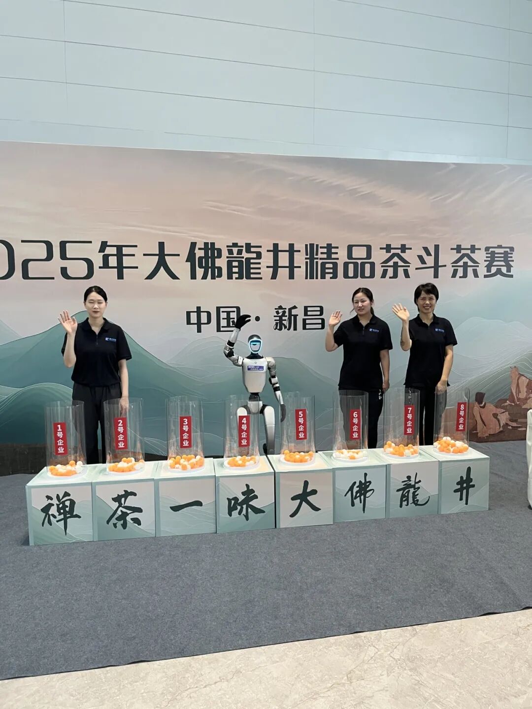 赛事之余,新昌大佛龙井精品茶斗茶赛同步开启,机械星球的机器人再次跨界 “出圈”!在斗茶赛现场,人形机器人站在 “禅茶一味 大佛龙井” 主题展台旁,与工作人员并肩,配合完成互动环节。