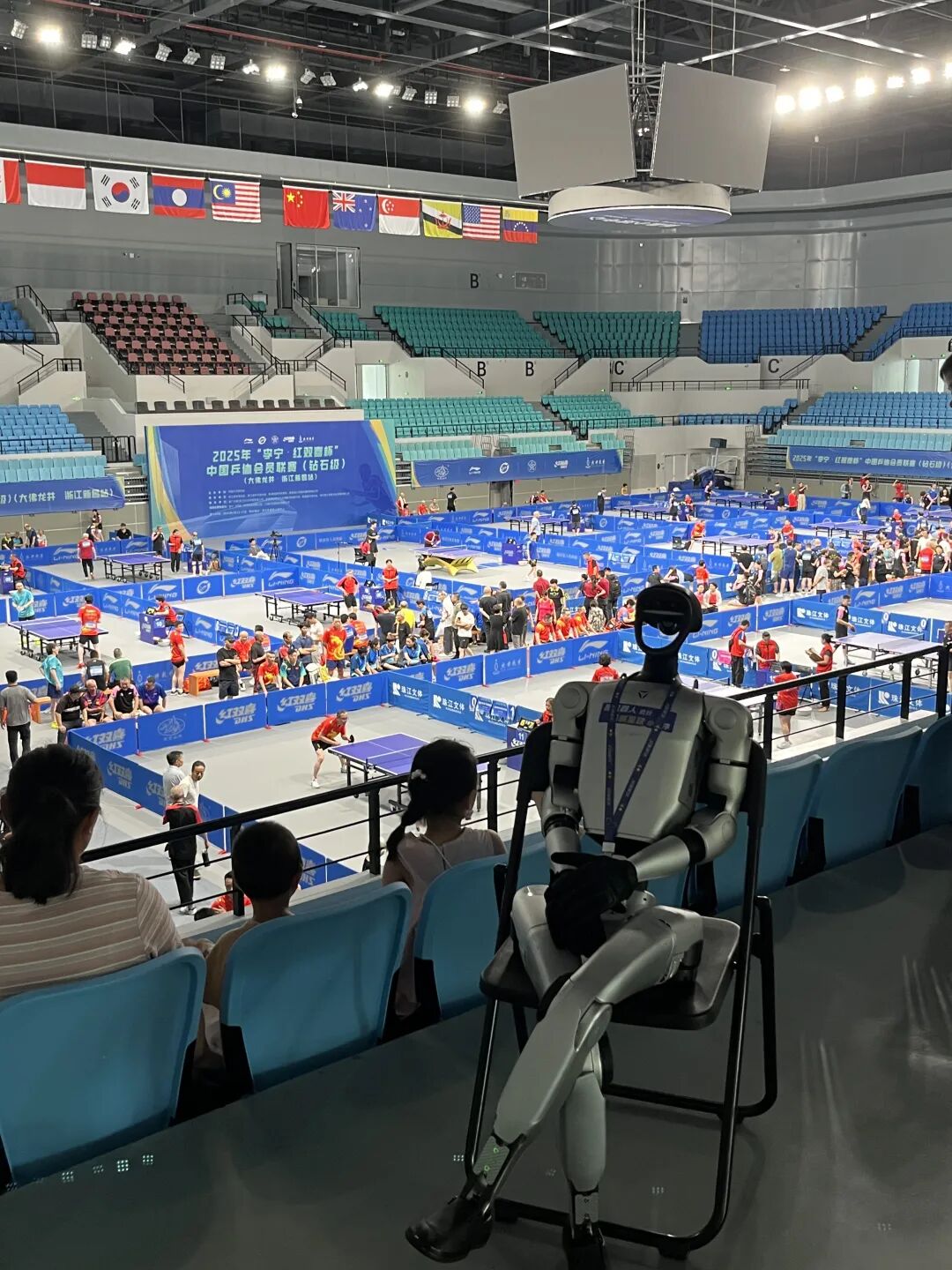 而在赛场外的场馆,是机械星球机器人天团的 “秀场”——银白金属身躯搭配流线设计的人形机器人,在观众席、签到处、领奖台来回 “打卡营业”。在观众席,它安静 “观战”,与蓝色座椅、热烈氛围奇妙融合,闲适的姿态引得路过的观众驻足停留,忍不住上前合影。到了签到处,它高高举起手臂 “热情迎宾”,胸前蓝色挂绳、标识清晰,和工作人员同框互动,成了选手签到时必晒的 “科技搭子”。